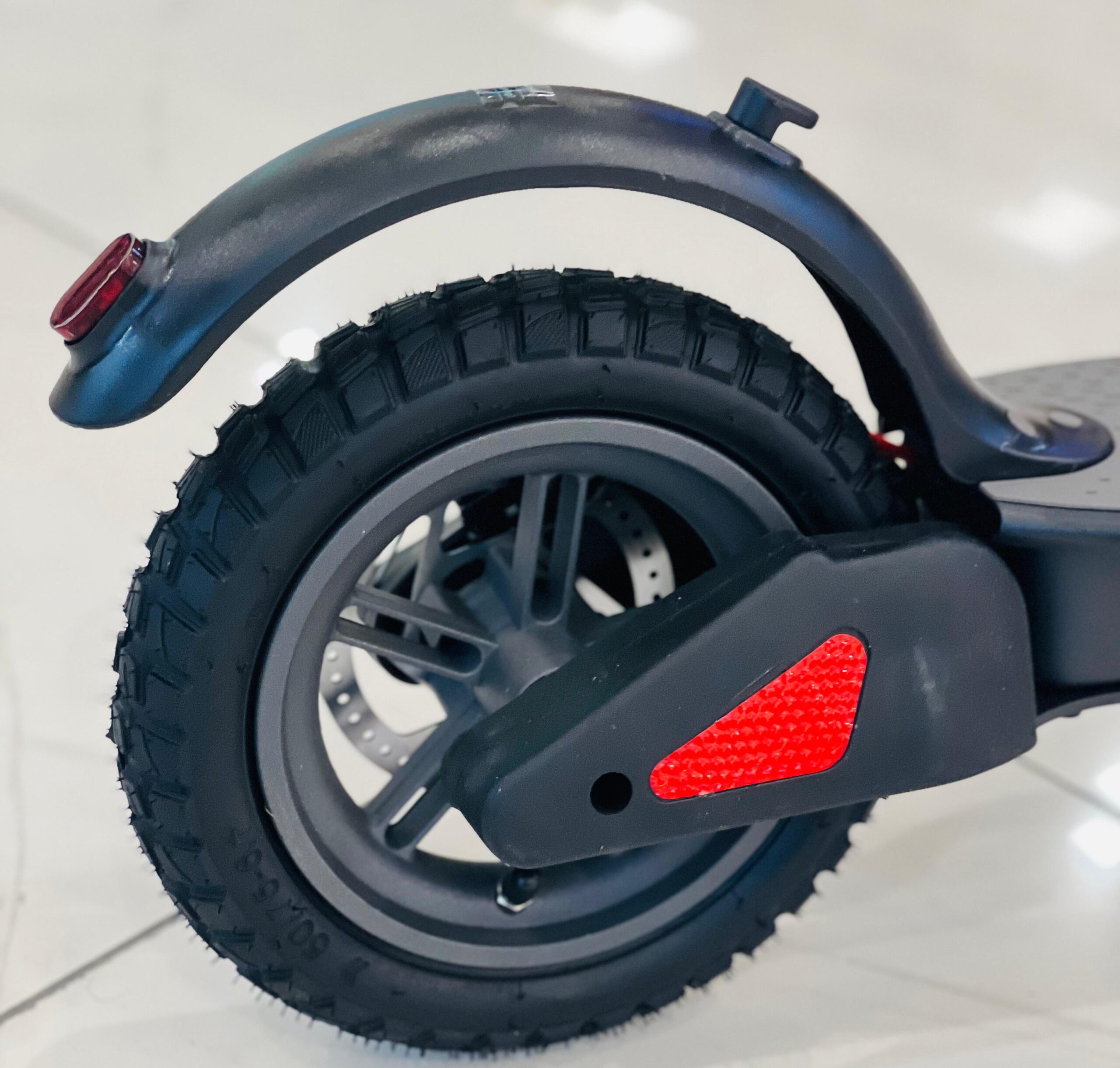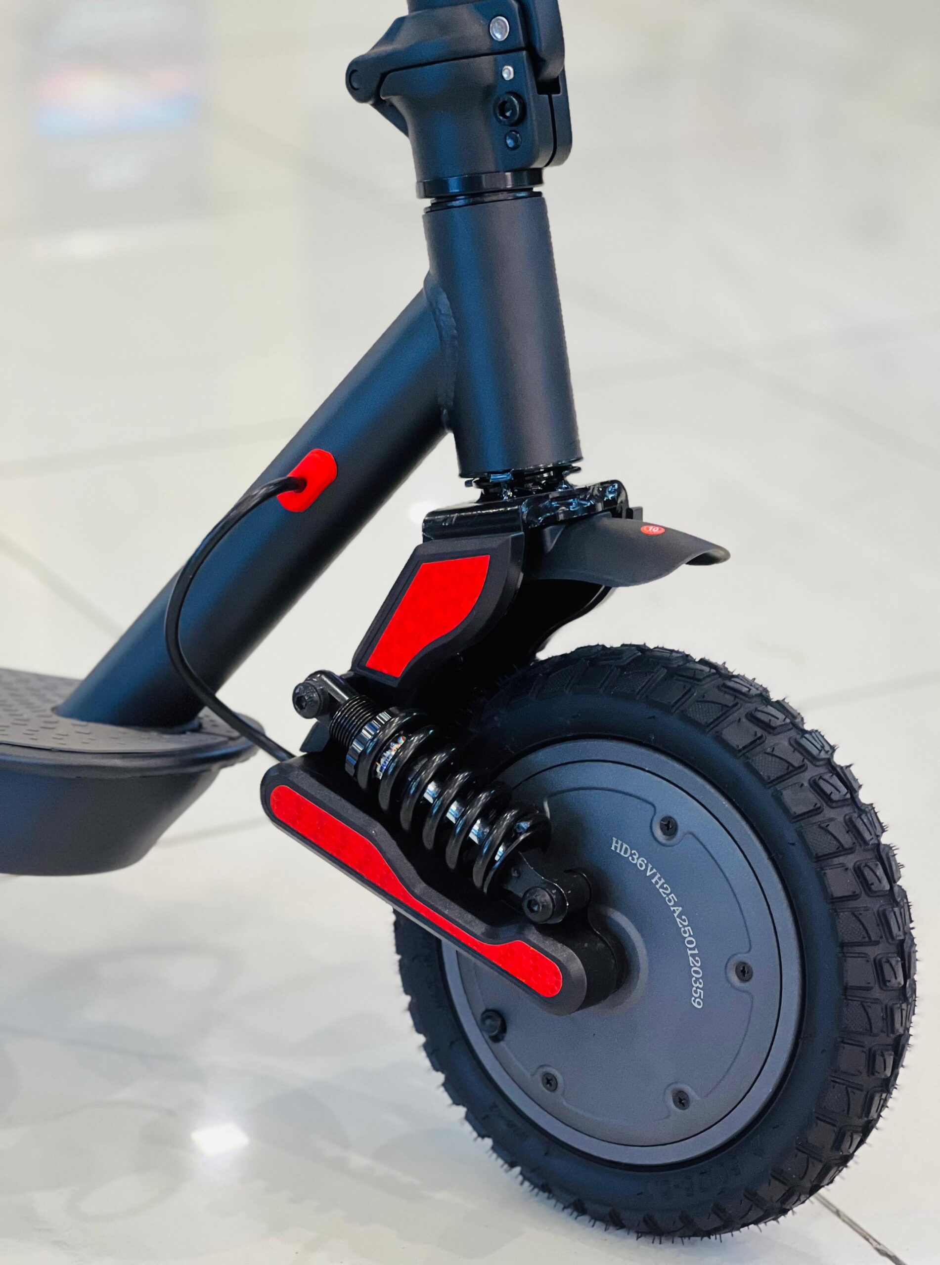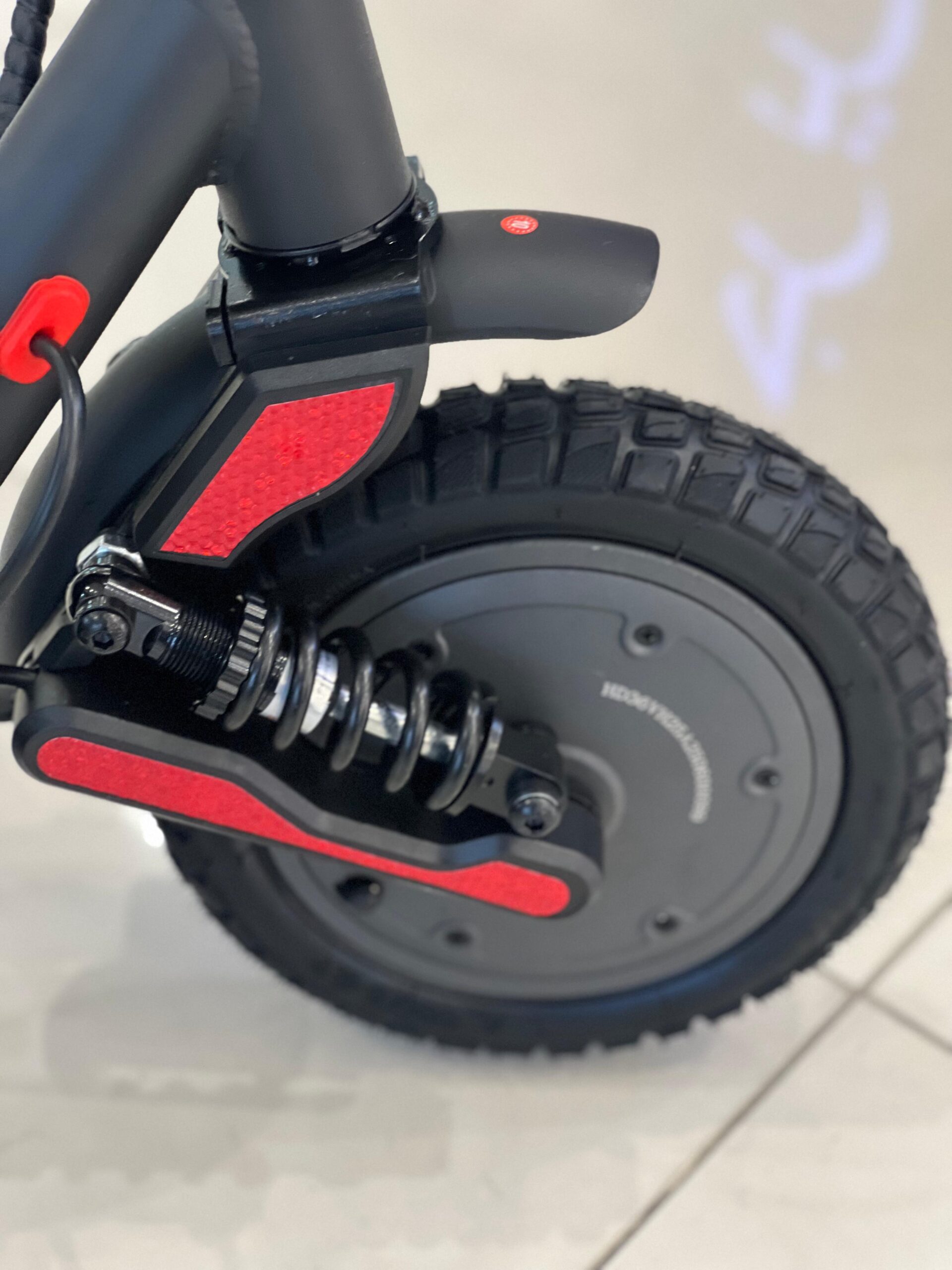 Supports 100 kg, weighs 14 kg. 8.5-inch solid tires and front shock for a stable, comfortable ride.